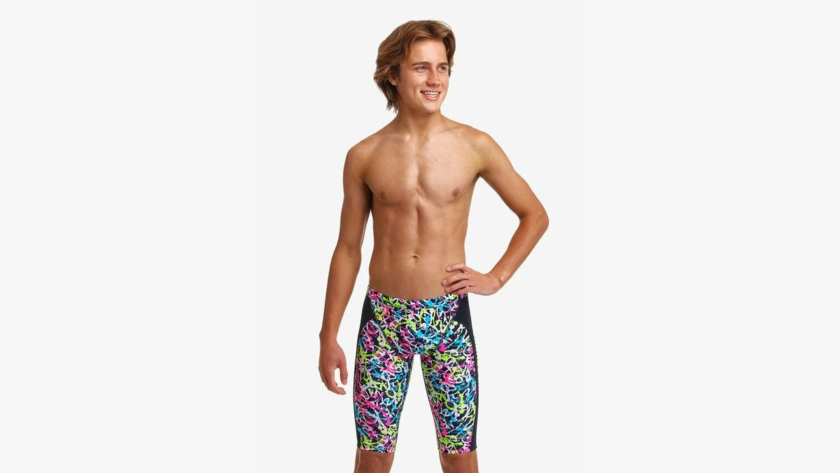 Made from Funky Trunks exclusive C-Infinity fabric, a 100% Italian polyester that is a colourful breakthrough in chlorine resistant fabric technology! The superior choice for swimmers, C-Infinity has exceptional strength and can retain its durability far beyond other elastane swimwear fabrics. Ideal for frequent pool use for recreational and performance based swimming.Â